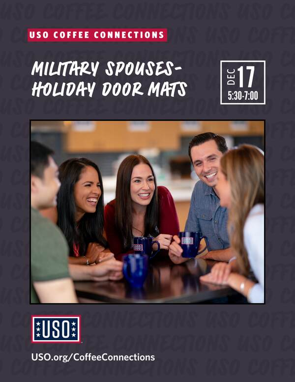 Join the USO as we host a gathering, specifically for military spouses! Connect with new friends, try a craft - Decorating Holiday Front Door Mats!!! or activity, explore the community, or simply relax with others in your community during this amazing event, just for you.