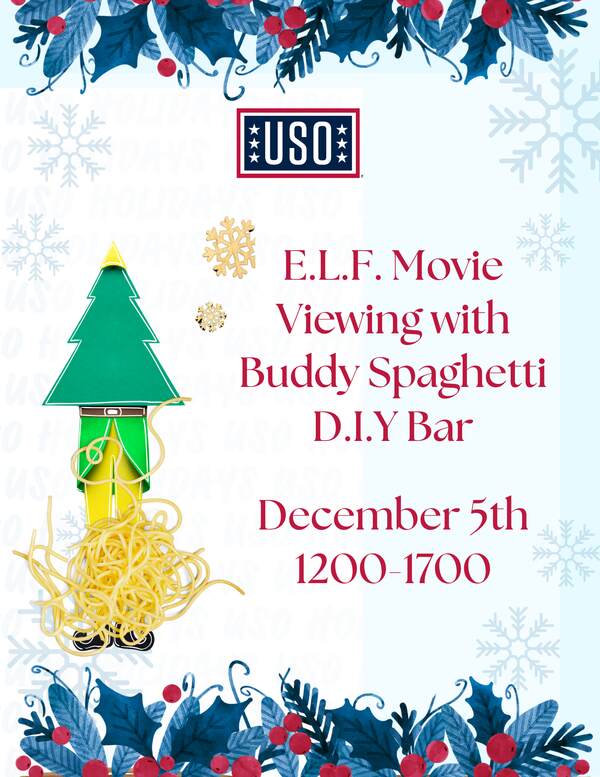 Elf Movie Viewing with Buddy’s Spaghetti Friday, December 5th As Buddy would say “Santa’s Coming”! Come to USO Great Lakes to watch “Elf” on the big screen and enjoy a Buddy Spaghetti Bar. No better way to get into the holiday spirit than to enjoy this movie classic! #theUSOHolidays