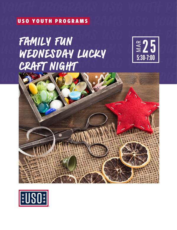 🍀🎨 USO Great Lakes is hosting our family-favorite Wednesday Craft Night! This week we’ll be crafting “Lucky” art—bring the whole family and enjoy the center, open exclusively to registered guests. 👉 Please register for the number of children participating in the craft.